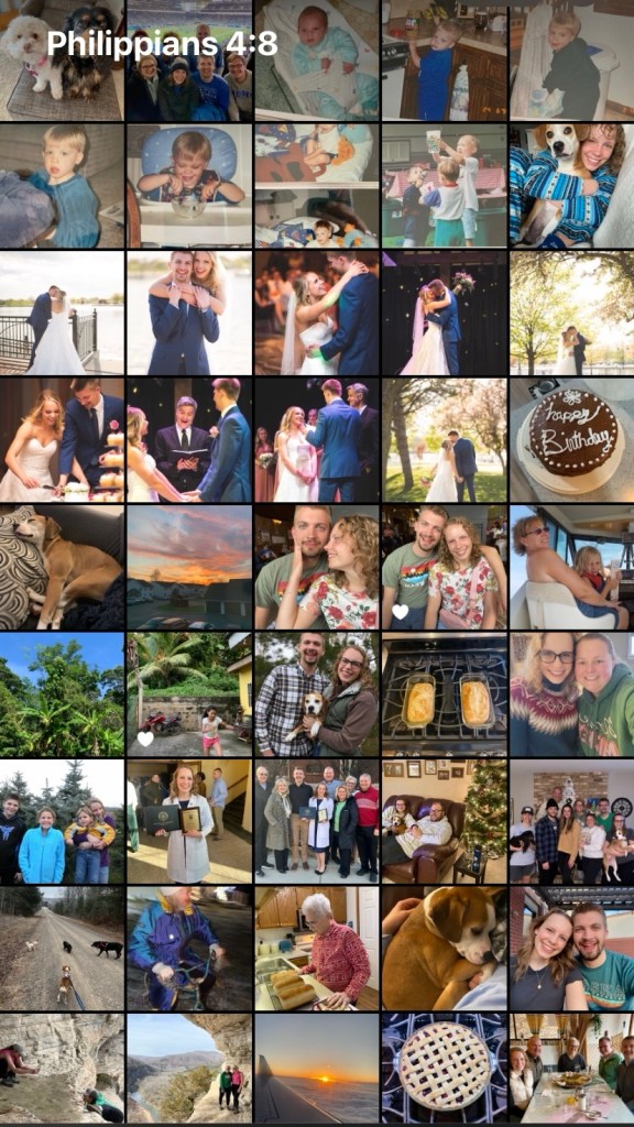 One way I have tried to help turn my mind to the attributes of Philippians 4:8 is by making a photo album on my phone of moments, places, and people that fit the descriptions. Here is a small piece of it: